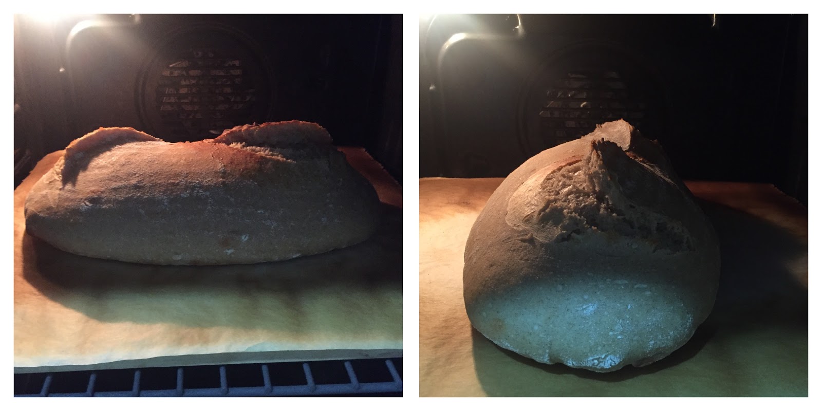 - Metemos el pan en el horno sin atemperar, añadimos agua caliente para generar bien de vapor rápidamente y bajamos a 200ºC, a los 15′ abrimos, sacamos la bandeja del agua, dejamos que salga el vapor y dejamos 45′ mas. Si vemos que se está quemando tapar el pan con un papel de plata. Tiempo total de horno : 60′